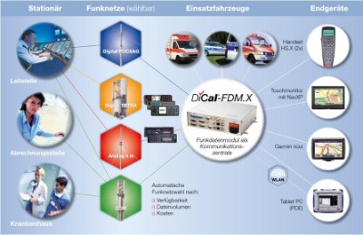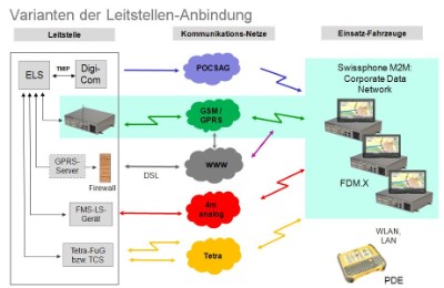 Leitstellenseite In der Leitstelle liegen die Routingdaten als Koordinatenpaar vom Einsatzleitrechner mit dem Einsatz vor. Ein entsprechender Softwaretreiber formatiert diese Daten zur Übertragung auf das FDM im Fahrzeug. Hierbei stehen unterschiedliche Funknetze zur Verfügung:
