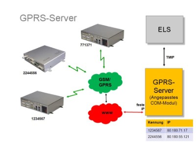 Unabhängig davon, welche Funk-Infrastruktur vom Anwender bevorzugt wird: Das FDM passt sich den Gegebenheiten bezgl. des Übertragungsmediums an. So kann sich der zur Übertragung verwendete Weg an Verfügbarkeit oder/und Kosten orientieren; eine Umschaltung auf den jeweiligen Funkweg ist sogar automatisch gegeben, wenn etwa in einem 4-m-Funkloch auf GPRS umgeschaltet wird. GPRS-Server Die GPRS-Datenübertragung zwischen der Leitstelle und den Fahrzeugen erfordert eine übergeordnete Verwaltungsinstanz. Der logische Bezug zwischen Fahrzeugkennung und IP-Adresse wird im sog. GPRS-Server (ein eigenständiger PC mit komplett installierter Firmware) verwaltet. Aufgabe des Servers ist es, die dynamische Adresszuordnung der Fahrzeugteilnehmer zu koordinieren. |